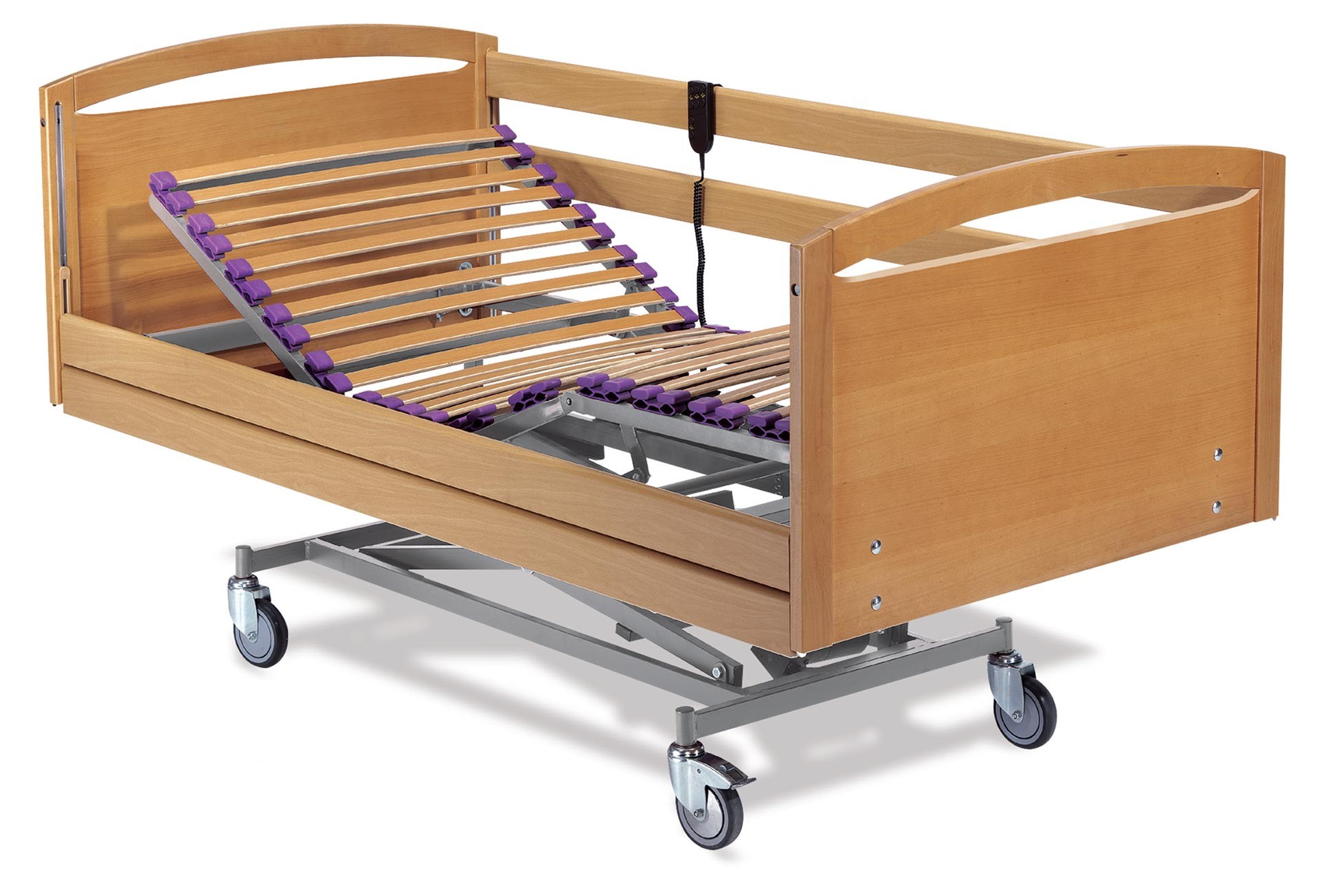 GERIATRIX: Cama Eléctrica Geriátrica de la mejor calidad del mercado. Cama eléctrica de 4 planos, con carro elevador, piecero, cabecero y barandilla de madera, frenos independientes con accesorios opcionales disponibles.
