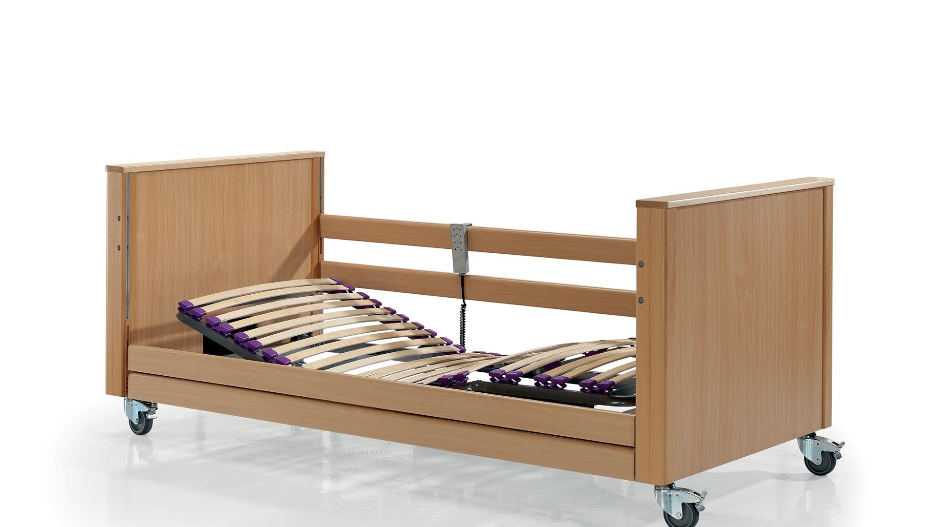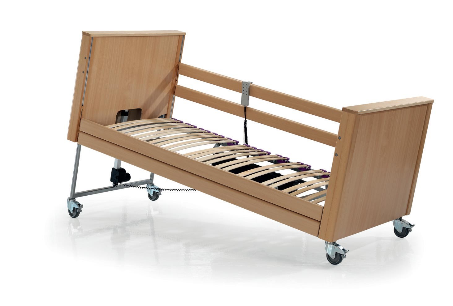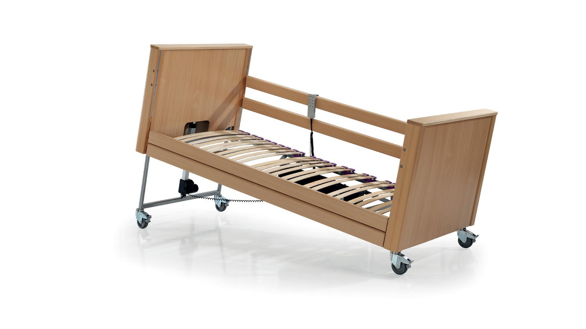 Cama Alzheimer Geriátrica con Carro Elevador, Cabecero, Piecero y Barandilla de Madera