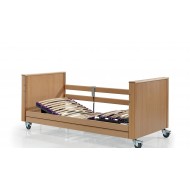 Barandillas de madera abatibles, a juego con el cabecero, que se suben o bajan fácilmente para permitir el acceso o salida del paciente de forma cómoda y segura.