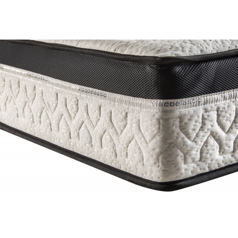 Colchón perfilado que está compuesto por un núcleo de 6 cm viscoelástica de 50 kg de densidad, sensible a la temperatura y a la presión, más 14 cms HR D30 para obtener la firmeza necesaria.
