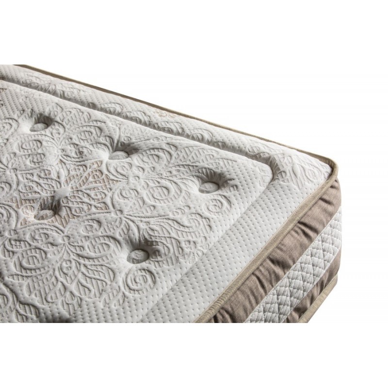 Colchón perfilado que está compuesto por un núcleo de 6 cm viscoelástica de 50 kg de densidad, sensible a la temperatura y a la presión, más 14 cms HR D30 para obtener la firmeza necesaria.