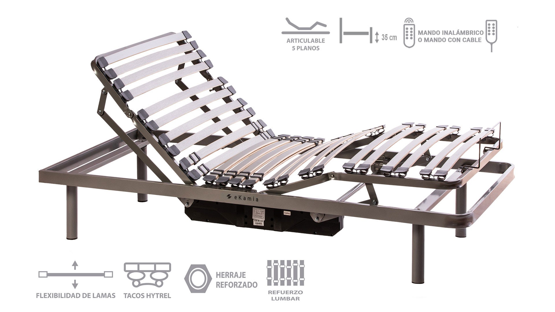 El material de la estructura es un tubo de acero de 50mm x 20mm esmaltado en epoxi termoendurecido, lo que nos ofrece la mayor resistencia estructural de este tipo de productos. Nos encontramos frente a un producto con una estructura de alta resistencia al impacto así como una óptima durabilidad y mantenimiento. El somier está reforzado para tener un funcionamiento óptimo en todo momento. Los planos de articulación son reforzados con alta resistencia para que puedan soportar el peso cuando esté inclinada en la parte de los pies.